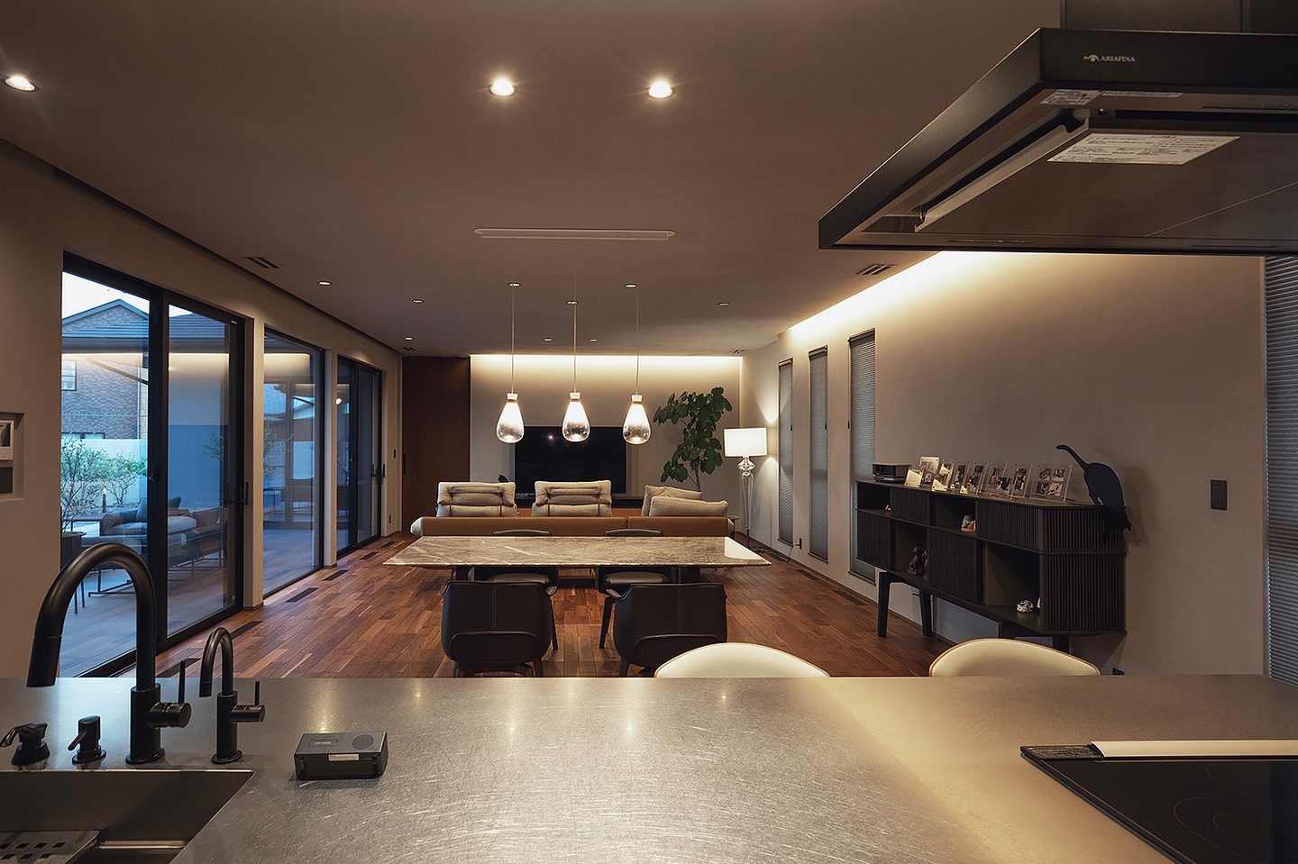 ペンダント照明と間接照明が広々したLDKに落ち着いた雰囲気を演出。