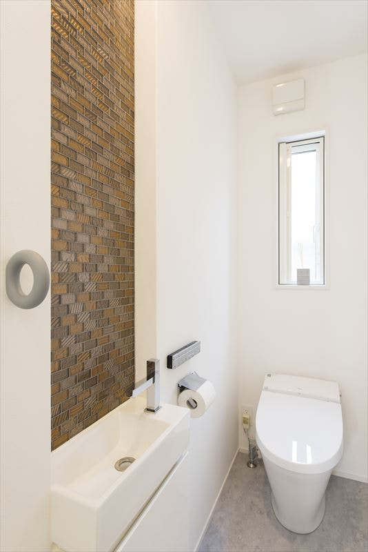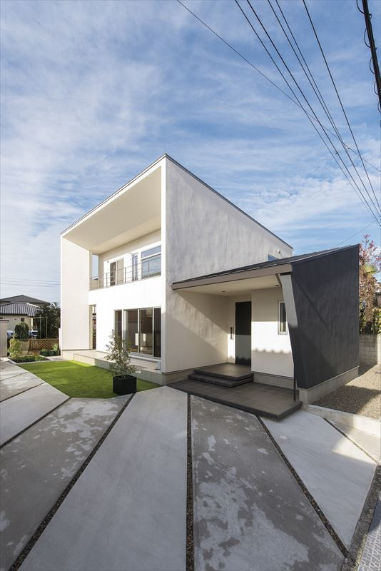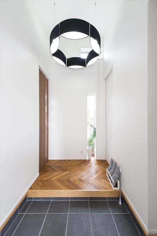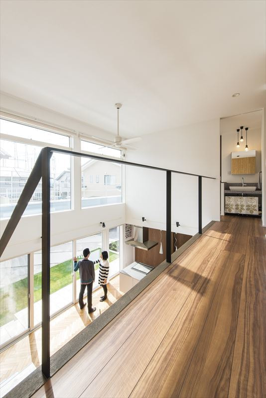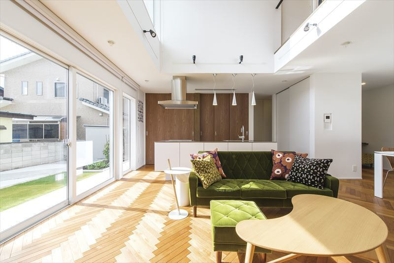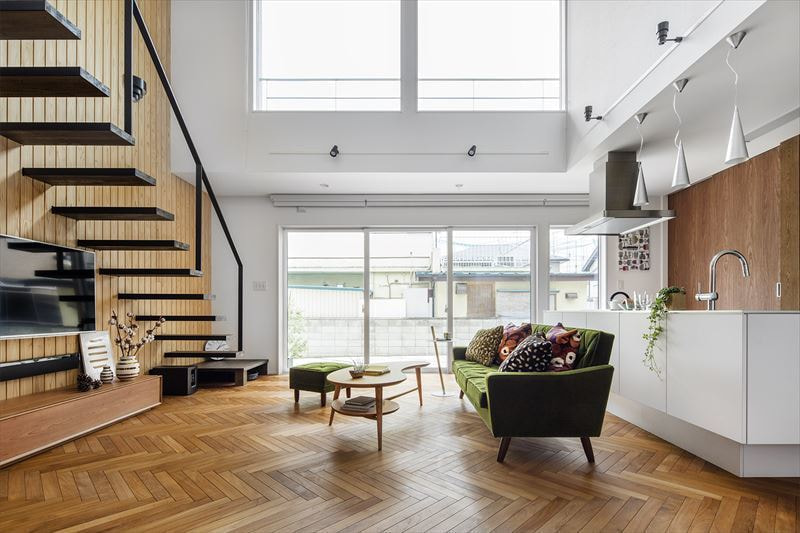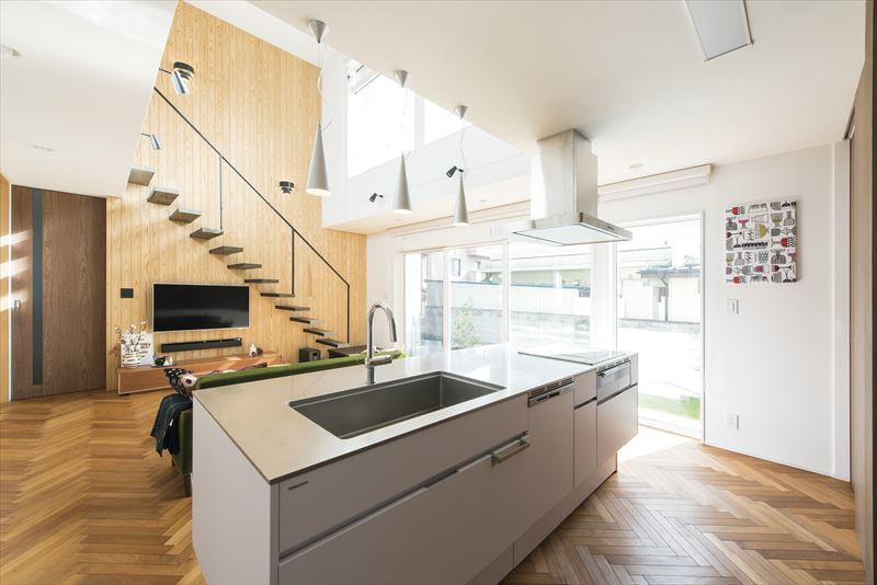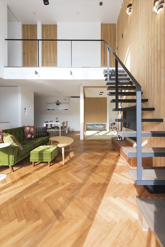 様々なところにお客様のセンスを感じ、それを当社の技術力・提案力で形にした「ヘリンボーンの床と浮遊する階段をもつ家」が完成した。
