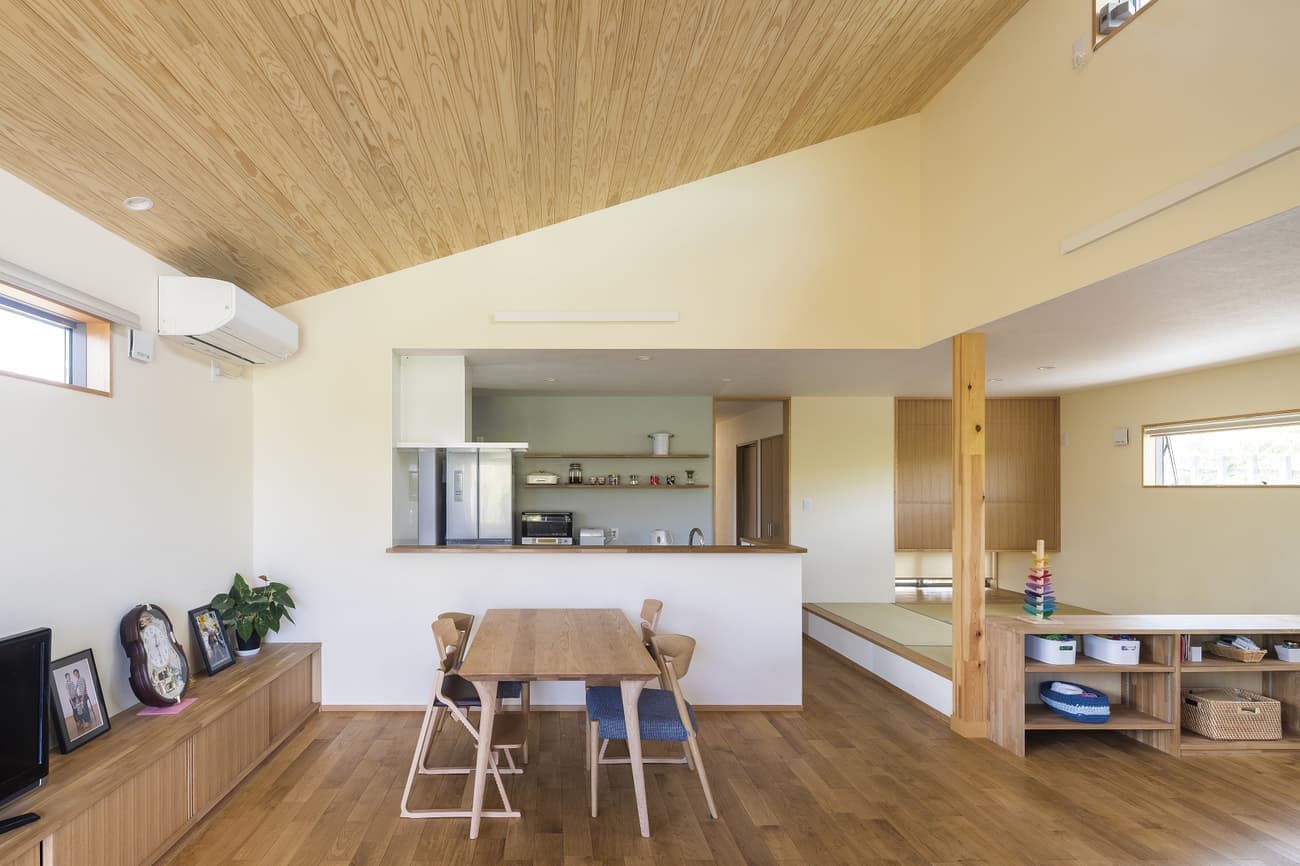 LDKをより広く見せる勾配天井と上部に設置したパッシブデザインを考慮した通風窓。