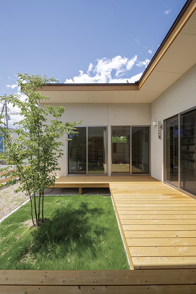 土地の形状を利用し、南北に長い土地でも明るく開放的に計画した「薪ストーブと中庭のある平屋の家」が完成した。