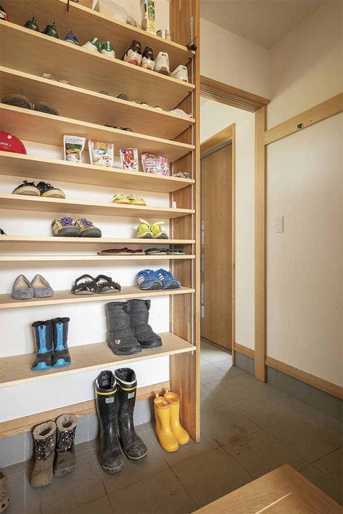 家族用とお客様用で分けた機能的な玄関スペース。