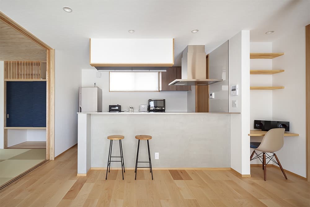 奥様こだわりのステンレスの薄いカウンター、カウンター下はモルタルで仕上げています。