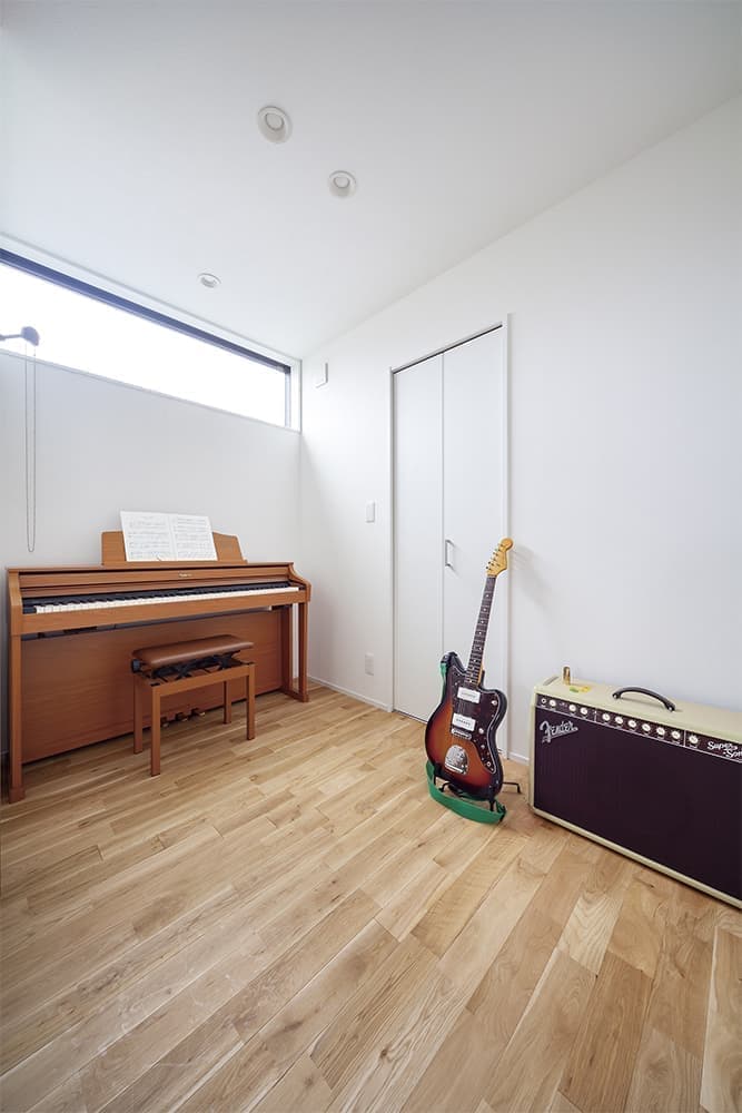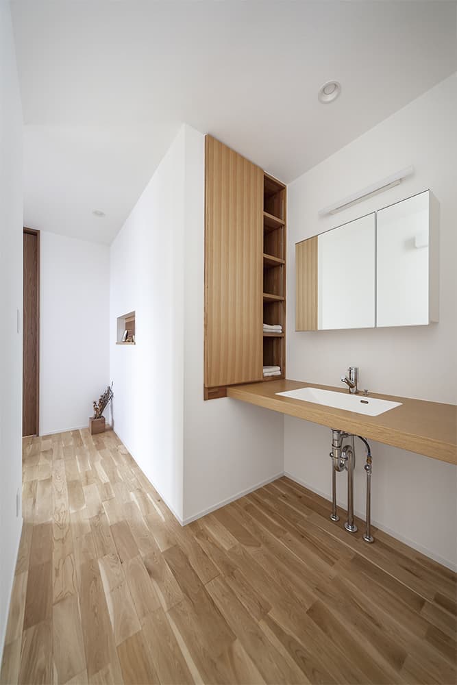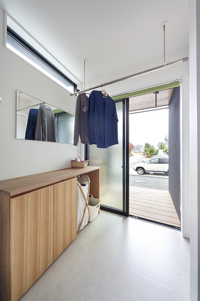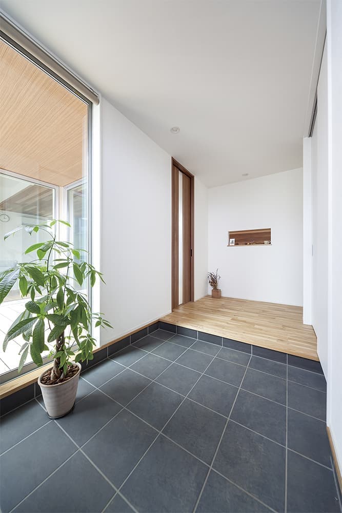 パティオに面した明るい玄関。正面には小さな飾り棚。
