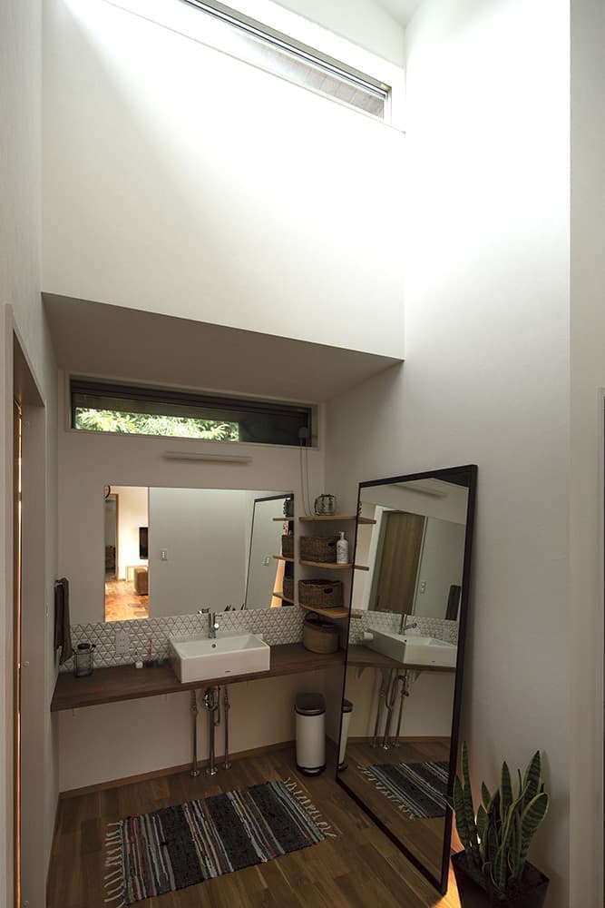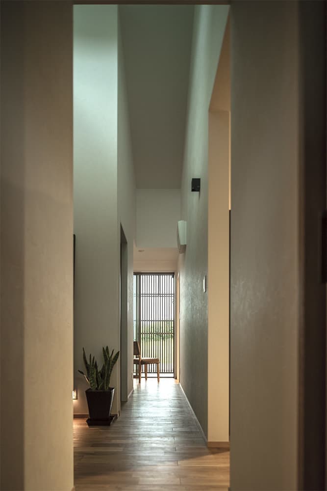 LDKの通風・視線に考慮した北側の中庭と上部の開閉できる通風窓。