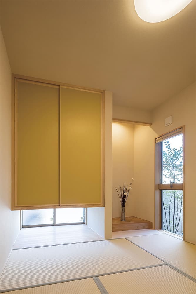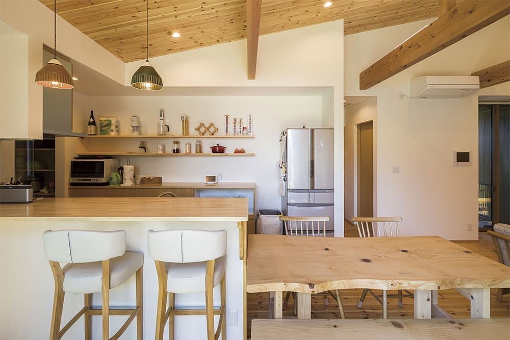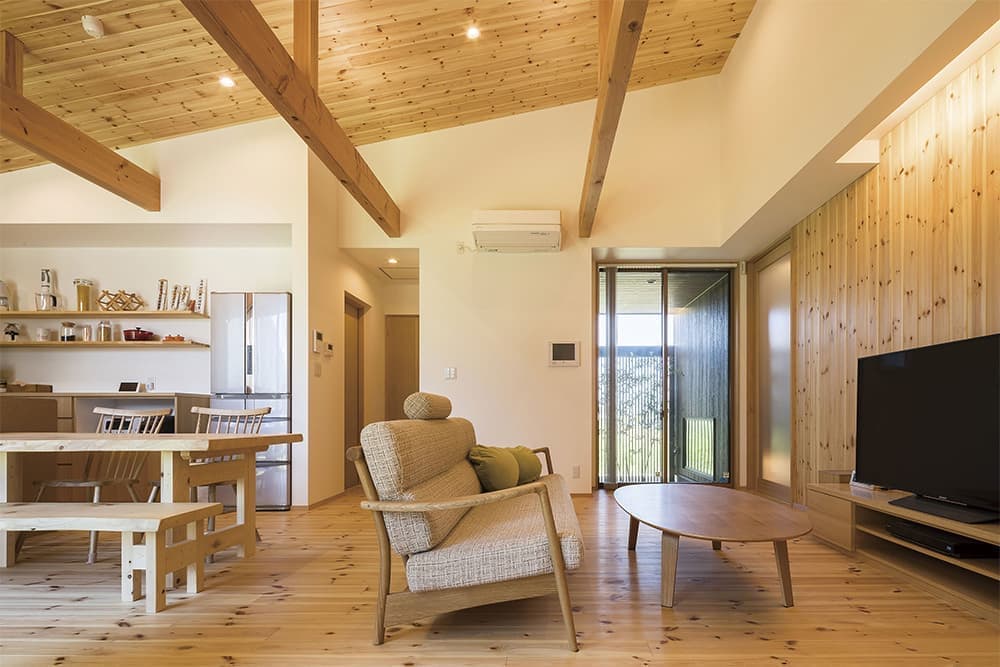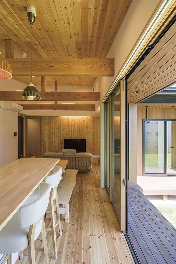 各部屋は光と風の抜けを考え大きな開口にし、坪庭を設けることで、さらにそこからも自然を感じられるようにしました。特にLDKは勾配天井にし開放感あふれる空間にしました。