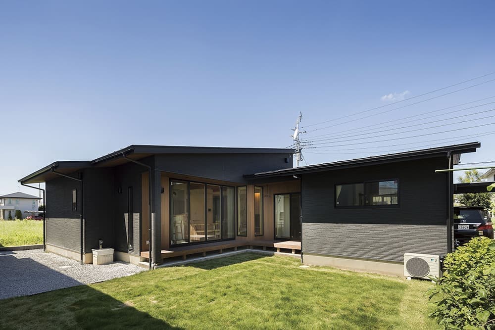 お客様のご要望は、3方向(東西南)を住宅で囲われていて特に南側は隣家がぎりぎりまで迫っているため、それを感じさせないようにしてほしい事、風や光がどこにいても感じられるようにしてほしい事、洗濯ものがすぐに干せるような家事動線にしてほしい事、トイレの1か所は介添えができる広さにしてほしい事、浴室から坪庭を眺めたい事、できるだけ自然素材で作り、梁を見せ広々としたリビングにしたい事、長期優良住宅にし太陽光も載せZEH住宅にしたい事、平屋にしたい事、が要望でした。