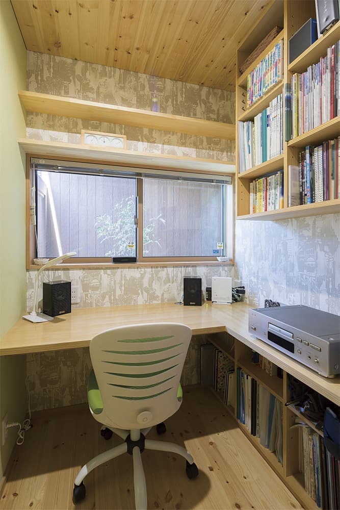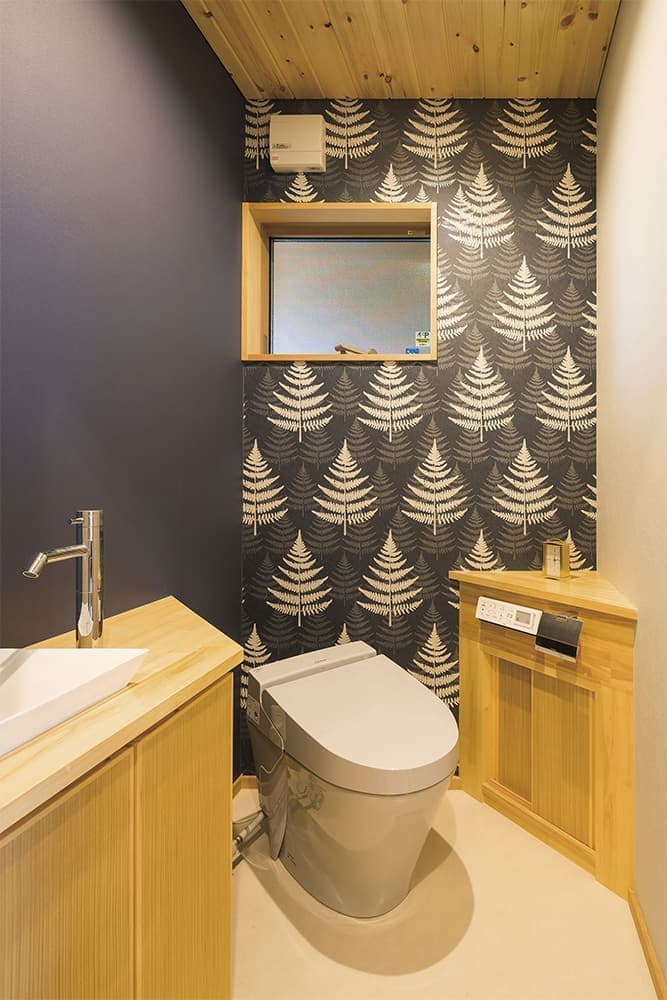 浴室と和室も同様な考えで坪庭を設けしています。洗面・脱衣・洗濯室は1か所で家族全員の収納ができるよう広くして、洗濯後、すぐホールで室内干しやデッキで外干しができ、その後 収納がすぐにできる便利な家事動線です。