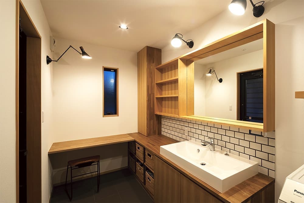 当社大工が得意とするL型の造作化粧スペース兼洗面台。