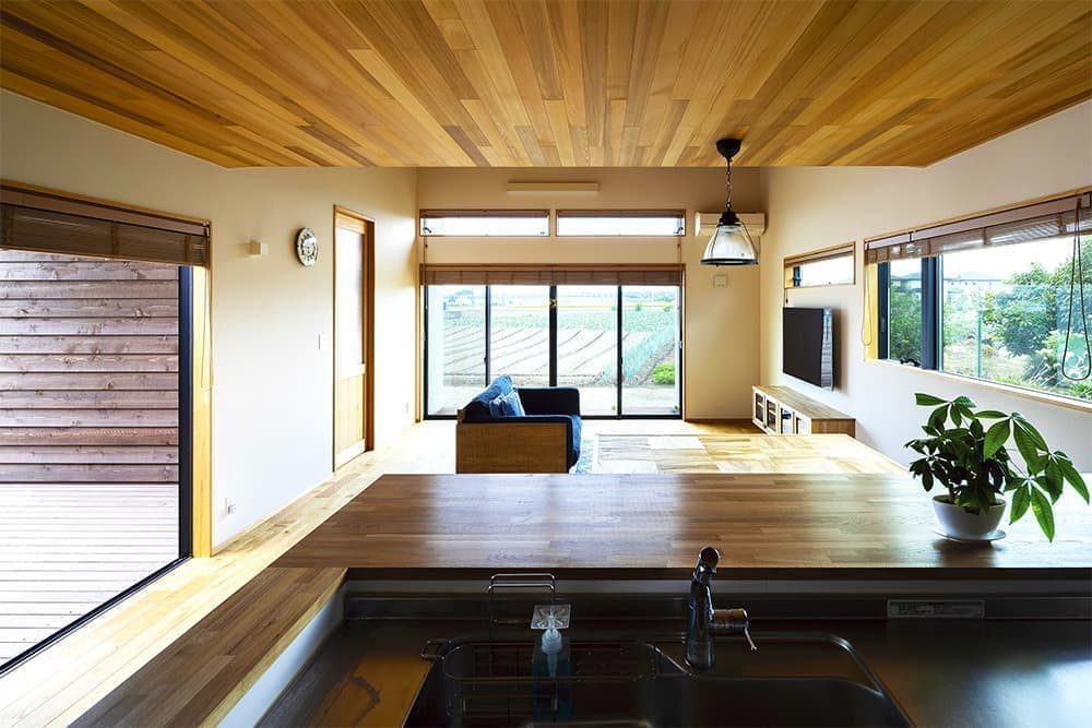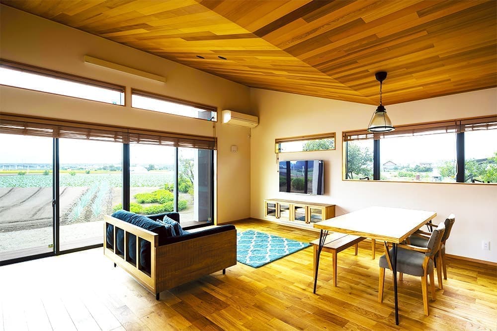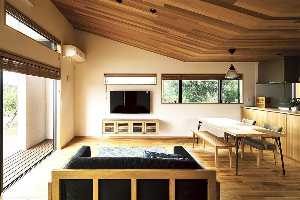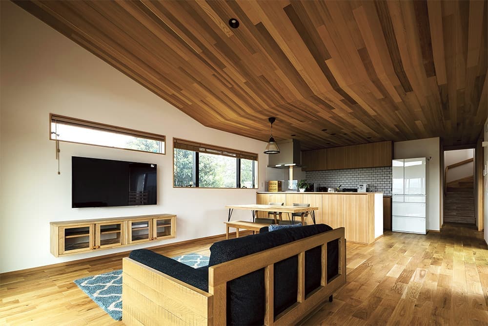 家の天井の半分以上に採用した色のまばら感が美しいレッドシダー貼り。