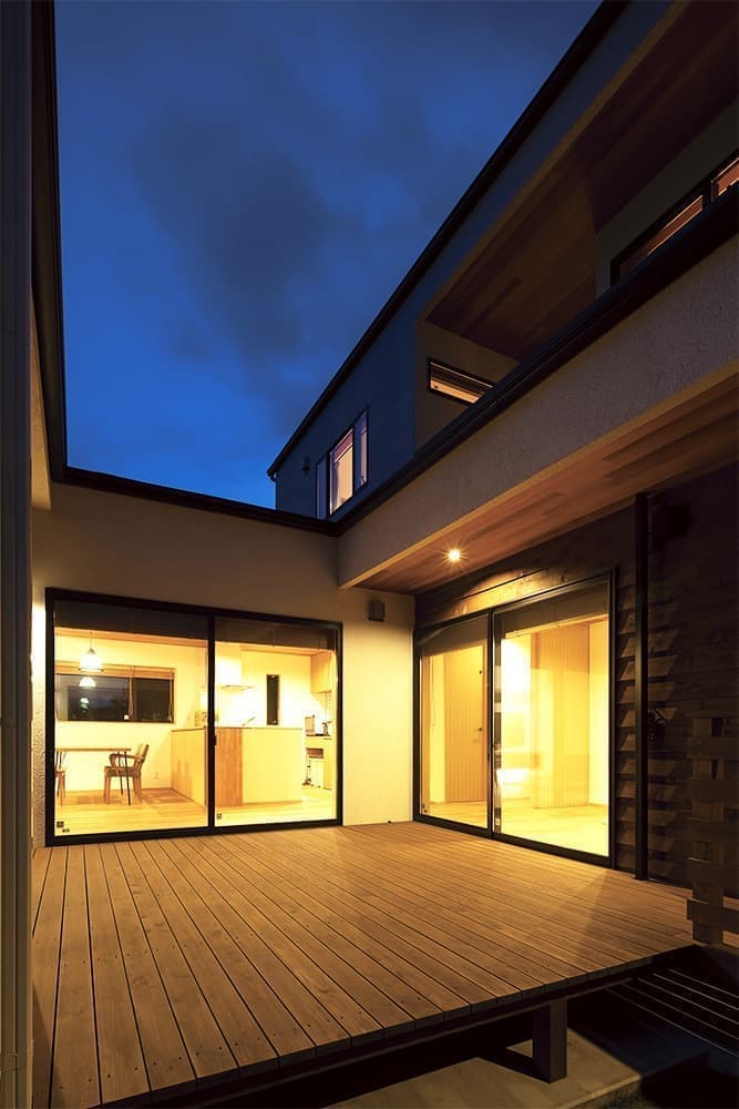 コの字で囲んだ中庭に配置した約13畳の広いウッドデッキ。
