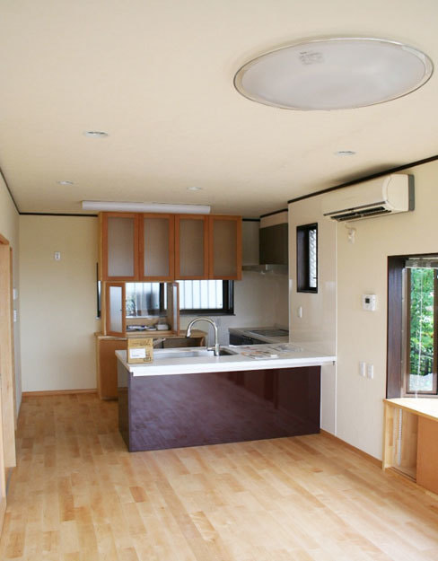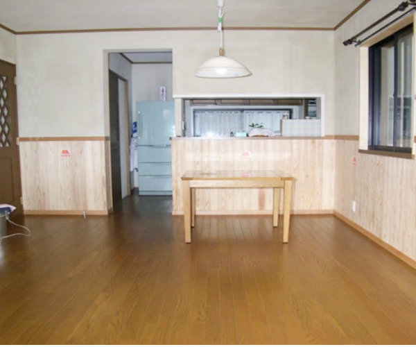 KDとリビングを分ける壁を撤去、対面キッチンにすることで少しでも空間を広く感じれるようにしました。内装も自然素材にこだわった健康リフォームです。