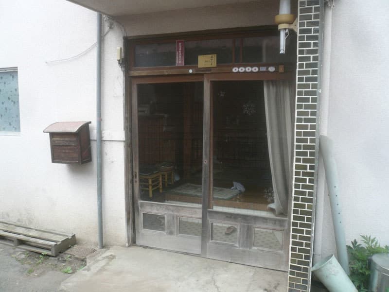 閉まらなくなった木製玄関戸。他のスペースから出入りは出来るのですが、古き良き和風調に合うように、デザインを選び、入れ替えを行いました。