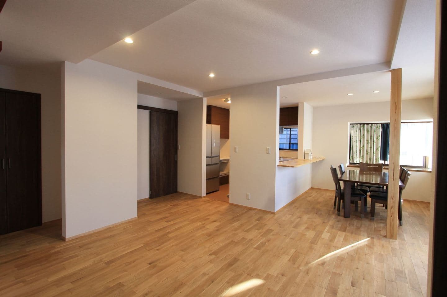 北側の和室を祖父母(両親)の部屋として考え、ご高齢なこともあり洋室としています。ご自身の寝室は、かつて3人のご子息が使っていた部屋を利用、子供達が帰省してきたときの為に客間として畳敷きにしました。また、ご家族全員が集まると15人ぐらいになるとのことで、現状のLDKを広げたいとの要望から、階段・廊下部分をLDKと一体化させることで、広い空間を実現。構造躯体の補強考えながら、必要な部分には見せる柱を考えました。