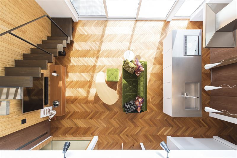 様々なところにお客様のセンスを感じ、それを当社の技術力・提案力で形にした「ヘリンボーンの床と浮遊する階段をもつ家」が完成した。