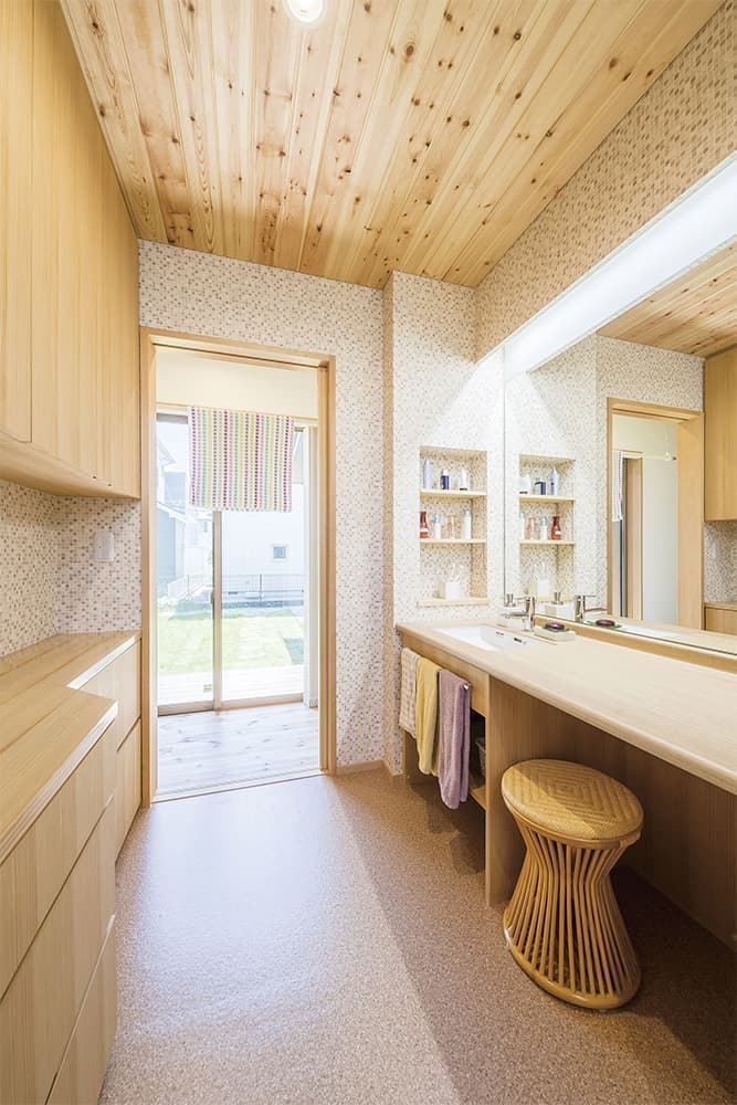 浴室と和室も同様な考えで坪庭を設けしています。洗面・脱衣・洗濯室は1か所で家族全員の収納ができるよう広くして、洗濯後、すぐホールで室内干しやデッキで外干しができ、その後 収納がすぐにできる便利な家事動線です。