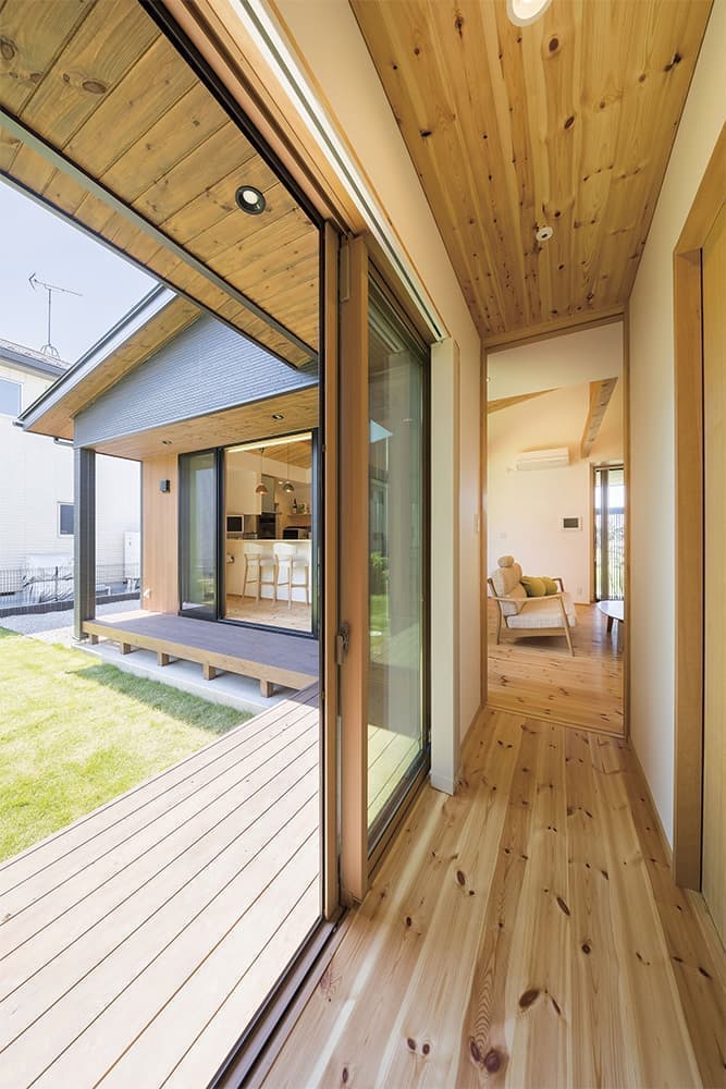 各部屋は光と風の抜けを考え大きな開口にし、坪庭を設けることで、さらにそこからも自然を感じられるようにしました。特にLDKは勾配天井にし開放感あふれる空間にしました。
