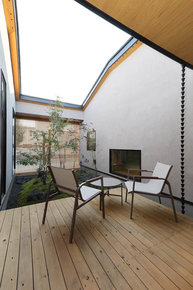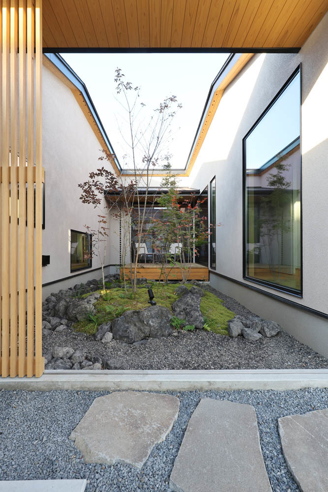日常生活を忘れさせる自然の美しさと静寂な中庭を最大限感じられるように、生活スタイルと動線を工夫した「中庭を中心として開放されたLDKのある家」が完成した