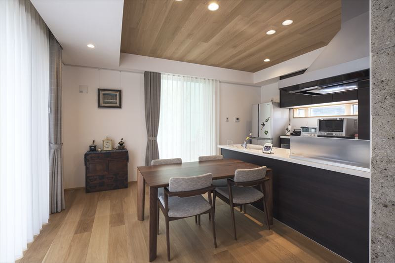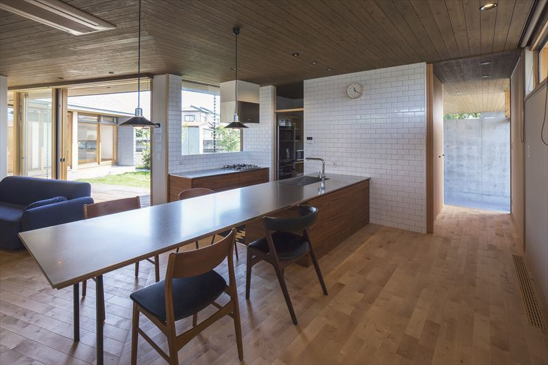 玄関ホールを抜けて現れるダイニングキッチン。テーブルと一体化した3.8mのキッチンカウンターは、日ごろの家事動線を考慮しつつ、家族や友人が大勢集う際にも庭を眺めながら気持ちよく食卓を囲む場所になるように細部のデザインもこだわり提案した。