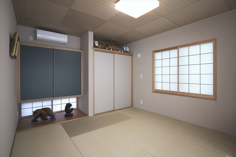 趣味多彩のご夫婦。個々の時間を楽しめる室も設けた。ご主人様の室・奥様の室は、格子戸を大きく開放できる。広めの回廊下は、室の一部のようになる。静の室は、和の空間。ご夫婦で過ごされたり、個々で過ごされたりできる。障子を開け広げれば、中庭の緑に誘われたかわいいゲストに会えるかもしれない。