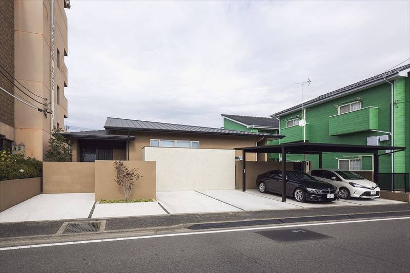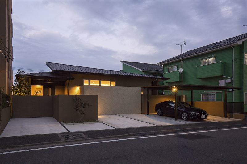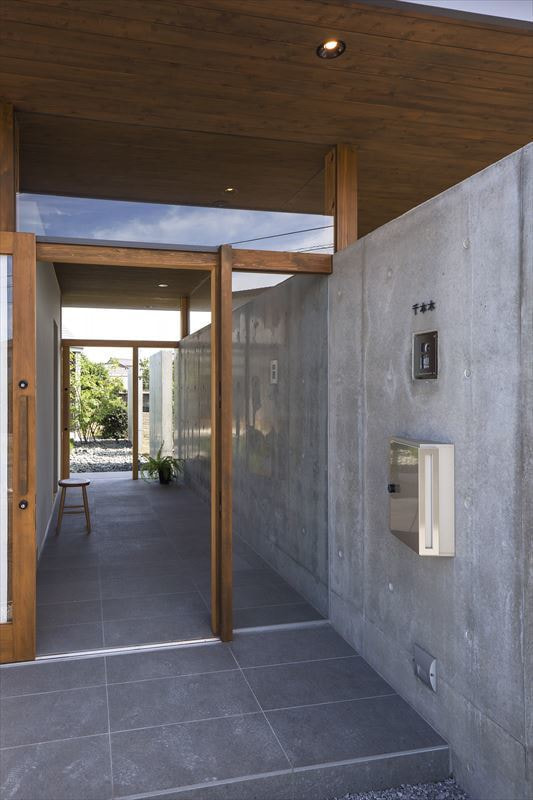 元農地の比較的広い敷地を塀ですべて囲みこむのは費用が掛かりすぎてしまうので、建物の形態とアプローチの軸線に建てられた最小限のコンクリート壁により、四方からの視線を止められるよう計画。周辺の住宅がほぼ切妻屋根の農家住宅が建っているところから切妻屋根の建物が敷地を取り囲むように配置し、その建物とコンクリート壁に囲まれた庭に向けて各室を配することで、それぞれに風や光が行き交い、外観からは想像できない広がりある内部空間を実現した。また、視線の抜けや角度の振れにより家族の気配を緩やかに感じ取ることができるよう計画した。