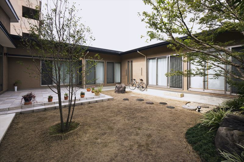 じる”がコンセプトだ。外部から遮断された空間。中庭の緑が季節を運び、光と風がご夫婦に寄り添うように時が流れる。