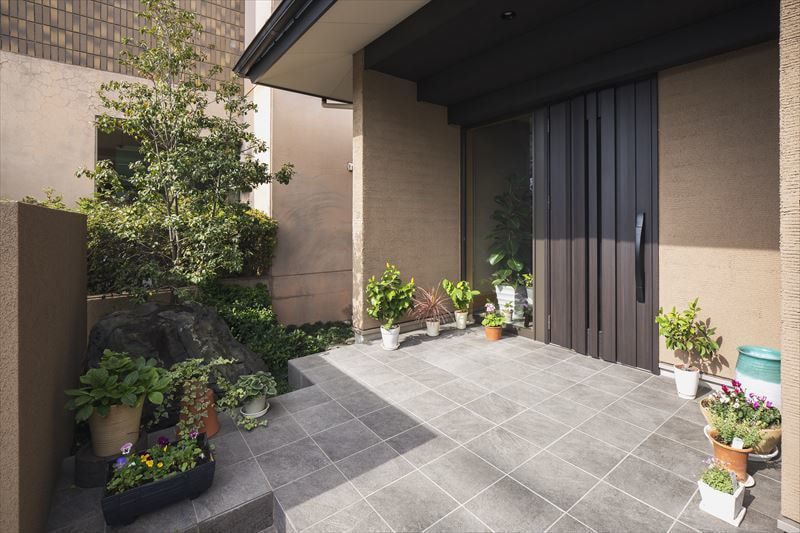 また、外観は前面道路からの視点に配慮した。住宅の南側に設けた外物置は、大谷石貼り。住宅の屋根の形・高さに変化をもたせ、外物置や外構とのバランス・調和を図る。