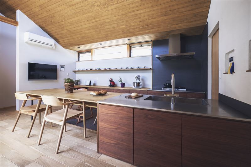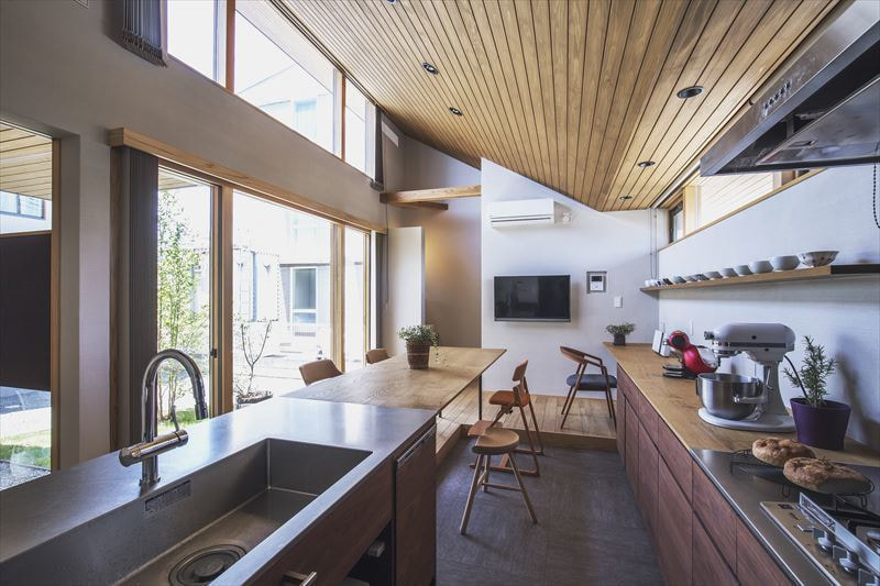 団欒の室は、中庭に面する北面を大きく開放。道路に面する南面は、ハイサイドを設けた。軒を出すことで、夏は日射を遮り、冬は日射を取り込む。敷地南側を閉じても、ふんだんに光がふりそそぐ。壁には漆喰、キッチンを隠すように大谷石乱形貼りの壁。ご主人様要望の自然素材があたたかみを演出。