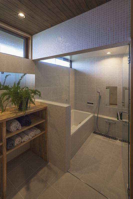屋内物干空間の充実、サンルームやウォークインクロークを近接させることで、洗濯家事動線の集約を図り、キッチンと玄関の間に収納力十分のパントリーを配するなど、共働きご夫婦のための家事負担軽減を実現した。
