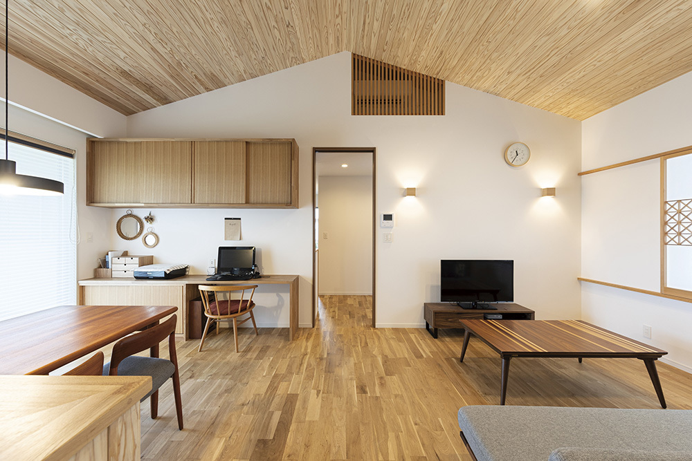 屋根の勾配なりに天井が設置されるので、変化もあり、開放的な空間となります。特にリビングはそのような天井にするととても気持ち良いと思います。予算が許せば、その屋根に木板などを貼るととても感じよくなります。