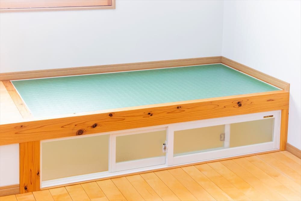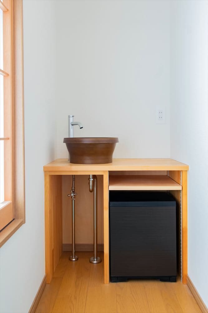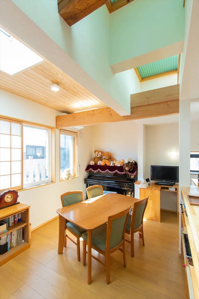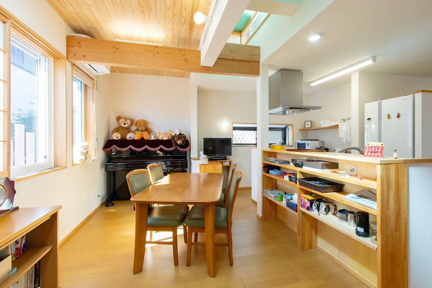 来客がリビングの前を通って玄関に行っていた動線を解消するため南東の角に配置し、今後のスタイルも考え、内部にはベンチや手摺を設置。また玄関から入っていったユーティリティーの天井をできる限り高くし、開放感のある空間としました。