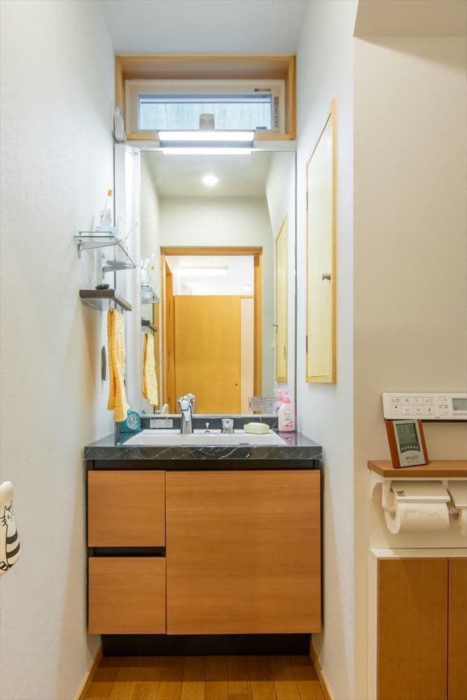 浴室からの脱衣室を確保し、洗面とトイレは同じ空間として小スペースをできる限り有効活用してみました。またキッチンの配置をアイランド型にし、いろいろな方向に動けるよう奥様の動線を確保しました。