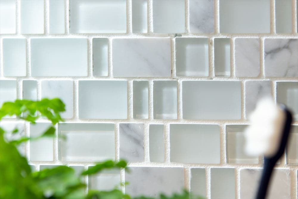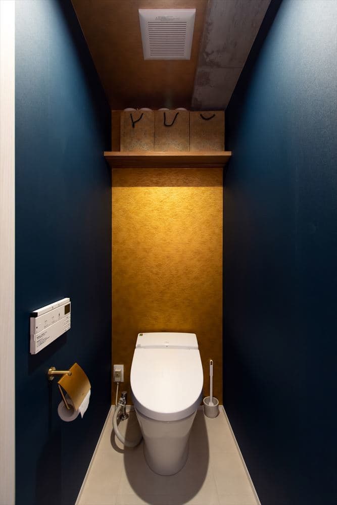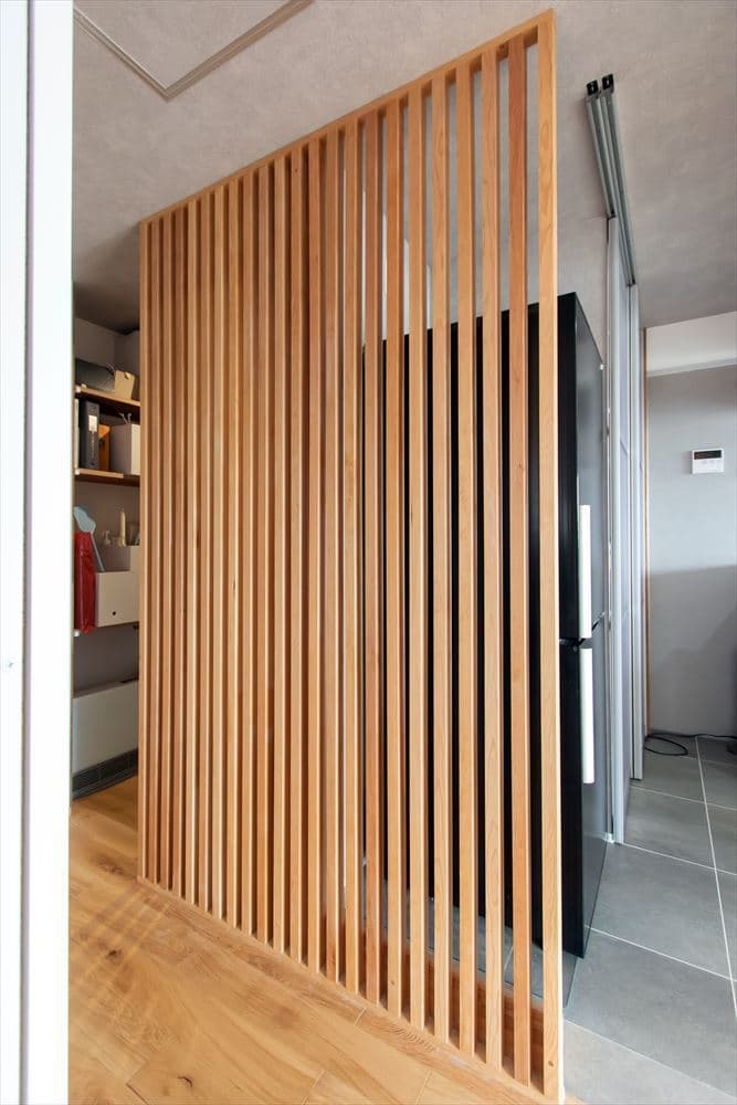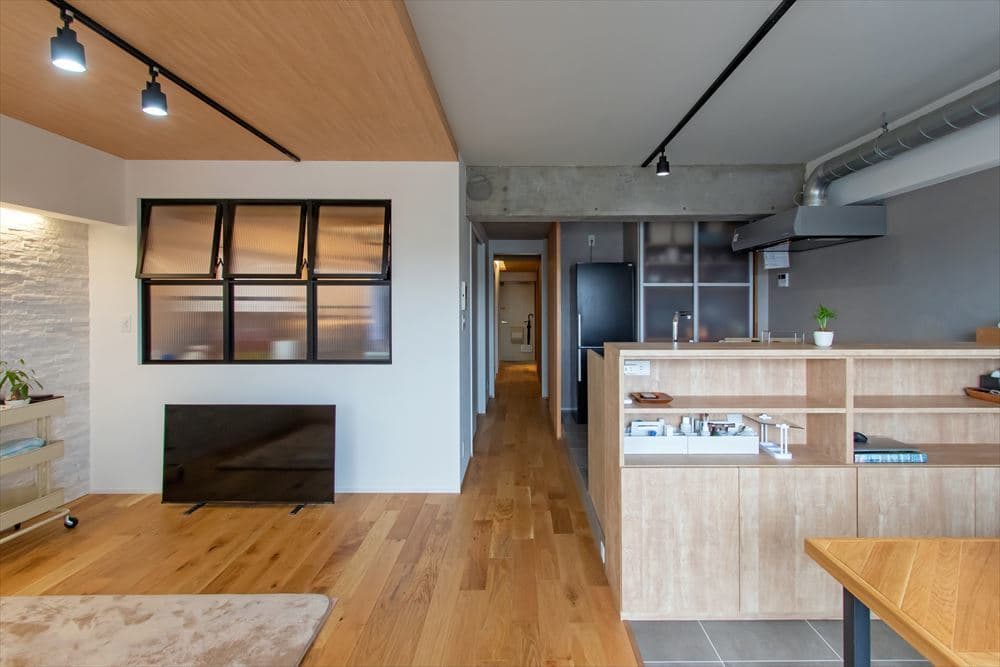 プランは限られた空間と設備配管の制約がある中、部屋の明るさを確保するためガラスブロックやガラス窓を利用し、木格子で空間につながりを感じさせるような工夫もしています。