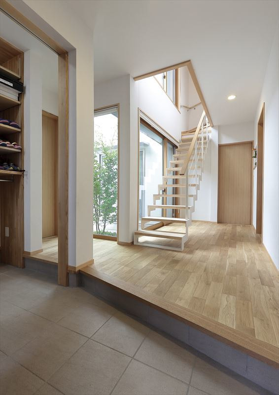 オープン階段と玄関から見える中庭