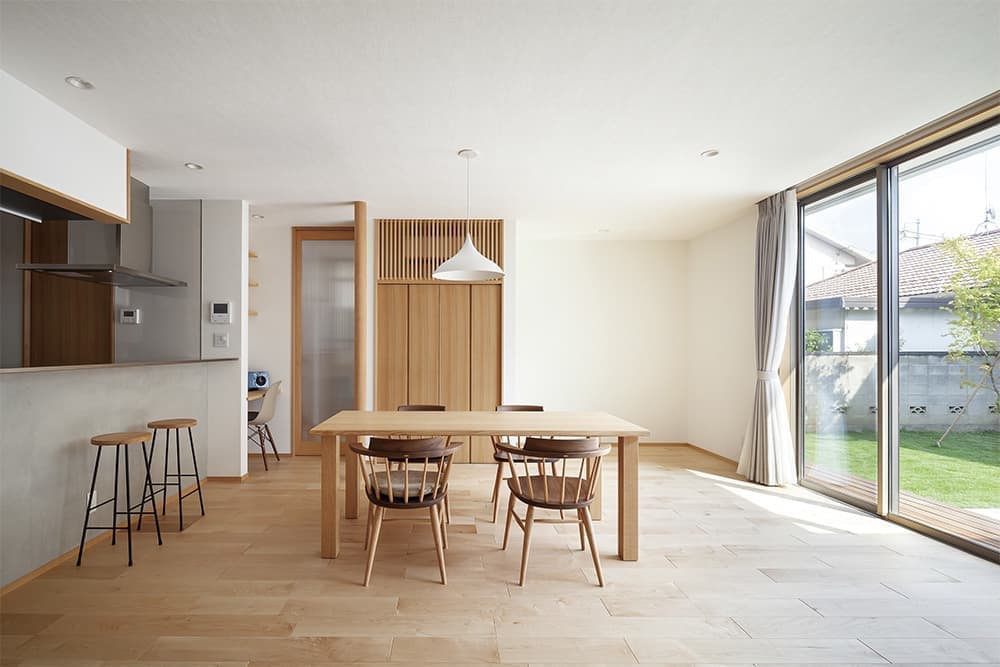 明るいダイニング、エアコンは正面収納上のガラリの中にあります。