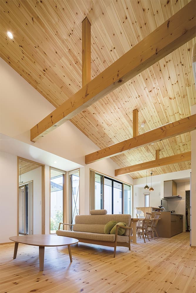 各部屋は光と風の抜けを考え大きな開口にし、坪庭を設けることで、さらにそこからも自然を感じられるようにしました。特にLDKは勾配天井にし開放感あふれる空間にしました。